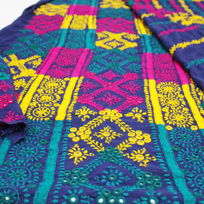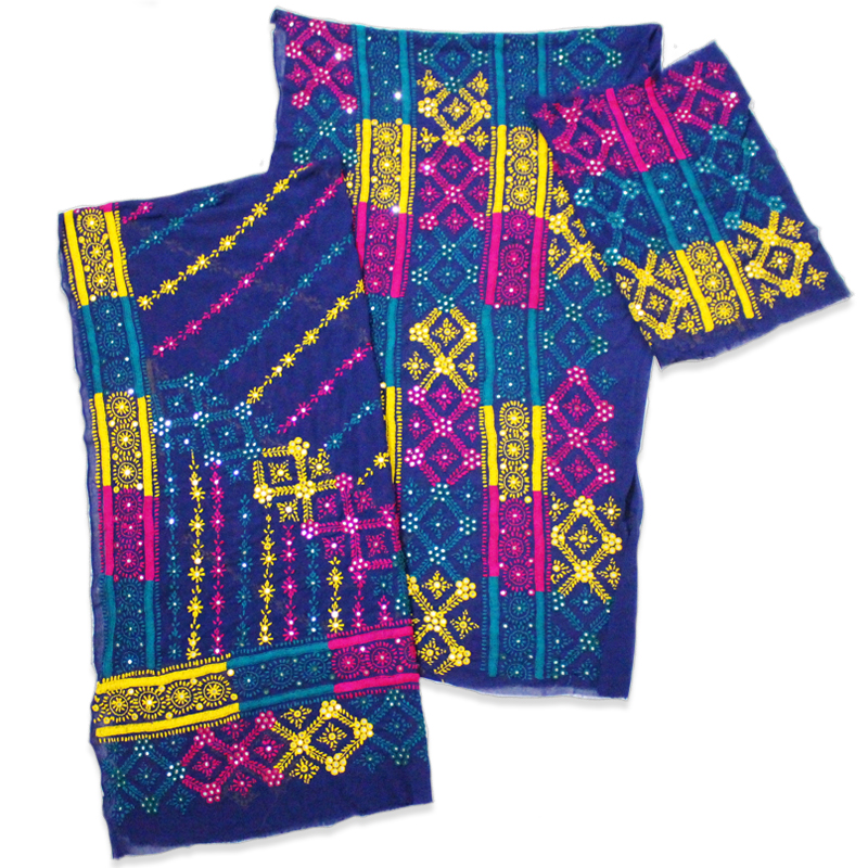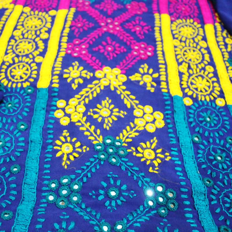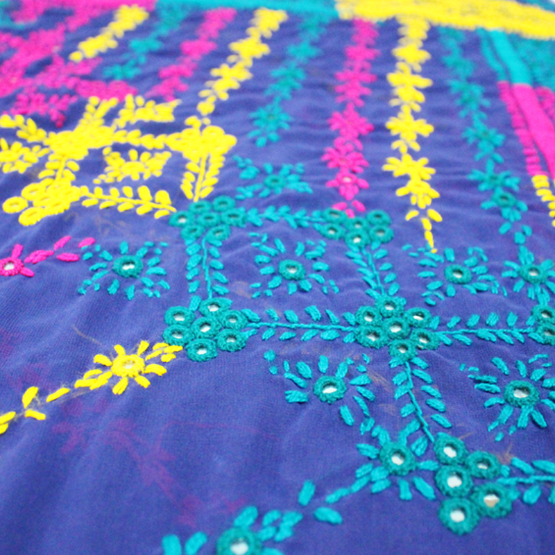 - Multi-color full embroidery with mirror work, on Navy Blue self-print base.